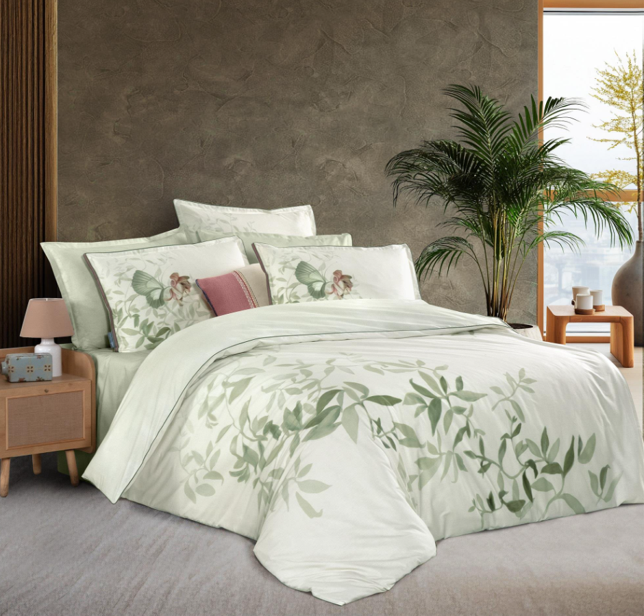 Bahar temalı yeşil yaprak ve çiçek desenleri, yatak odanıza ferah ve doğal bir görünüm kazandırır